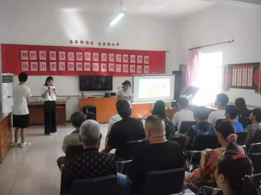 在杨柳青镇政府的大力支持下,“绿动青城——垃圾分类与资源循环利用的实践应用”实践团队走进柳轩苑社区居委会,为社区居民进行垃圾分类相关知识的宣传。本次宣传过程乐趣横生,实践团队将垃圾分类知识及宣传口号融入经过精心排练的三句半、相声、小品等深受居民们喜爱的表演形式中。